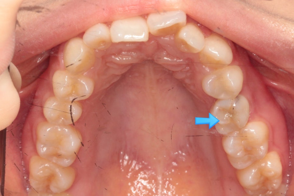 화살표 부위가 결손치아입니다. 유치가 남아있네요.